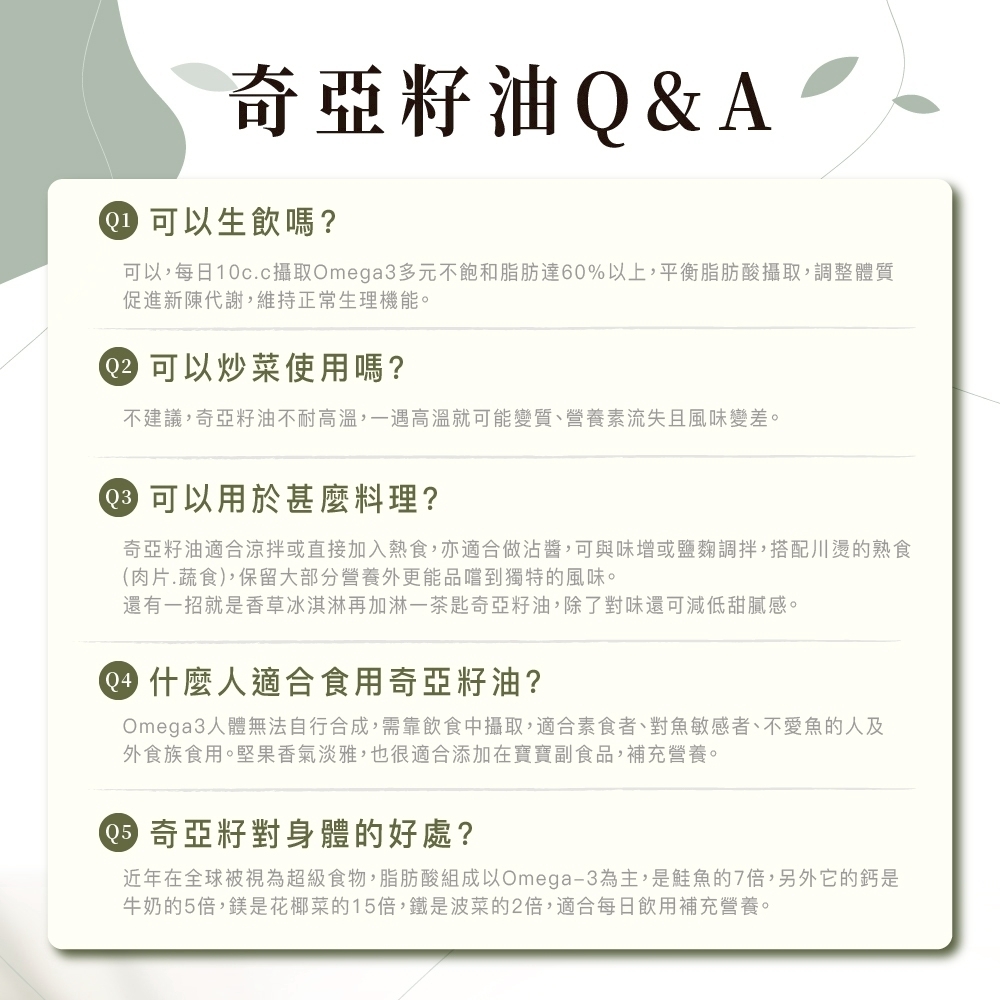 ‧近年在全球被視為超級食物,脂肪酸組成以Omega-3為主,是鮭魚的7倍,另外它的鈣是牛奶的5倍,鎂是花椰菜的15倍,鐵是波菜的2倍,適合每日飲用補充營養。
